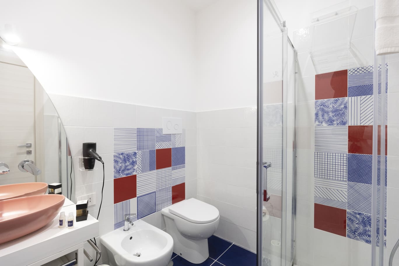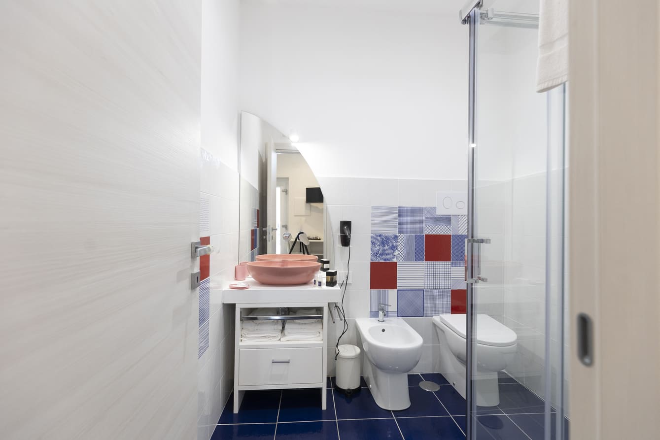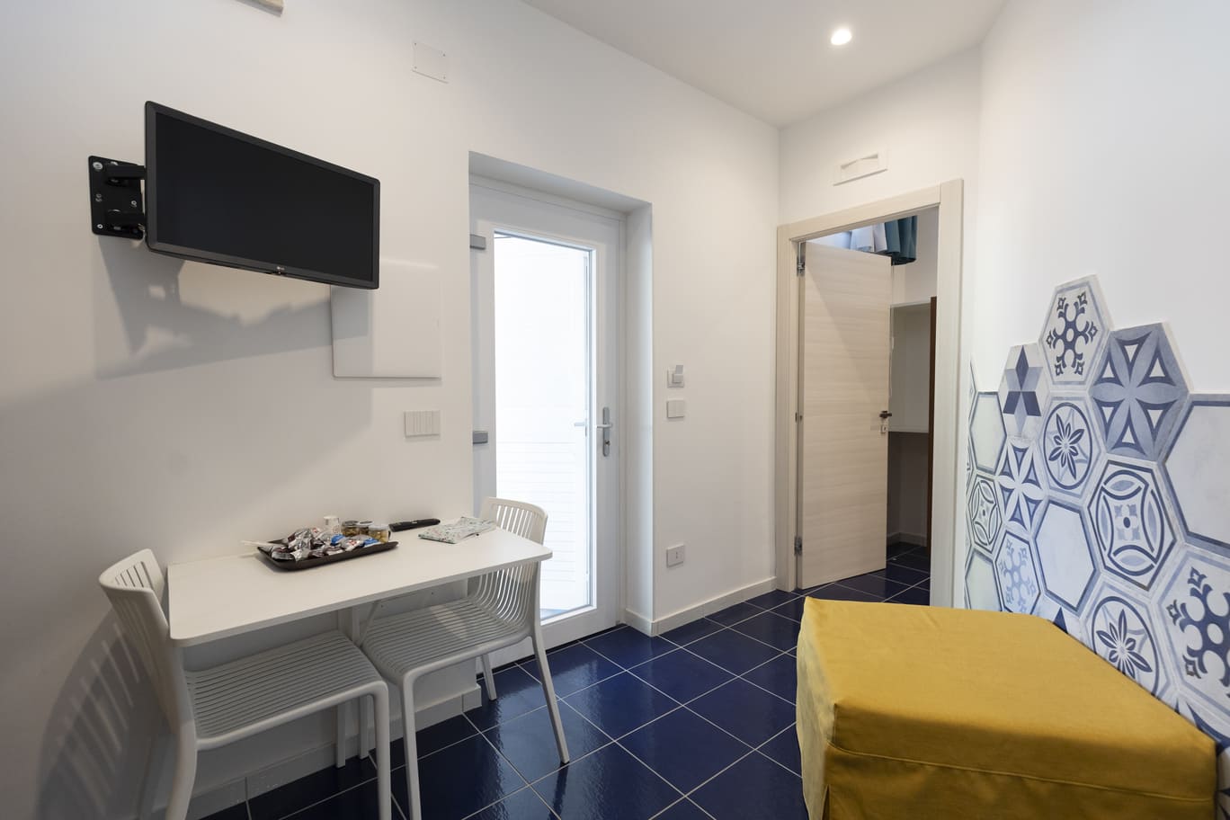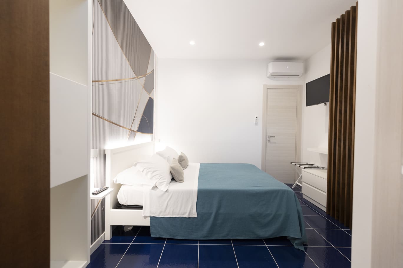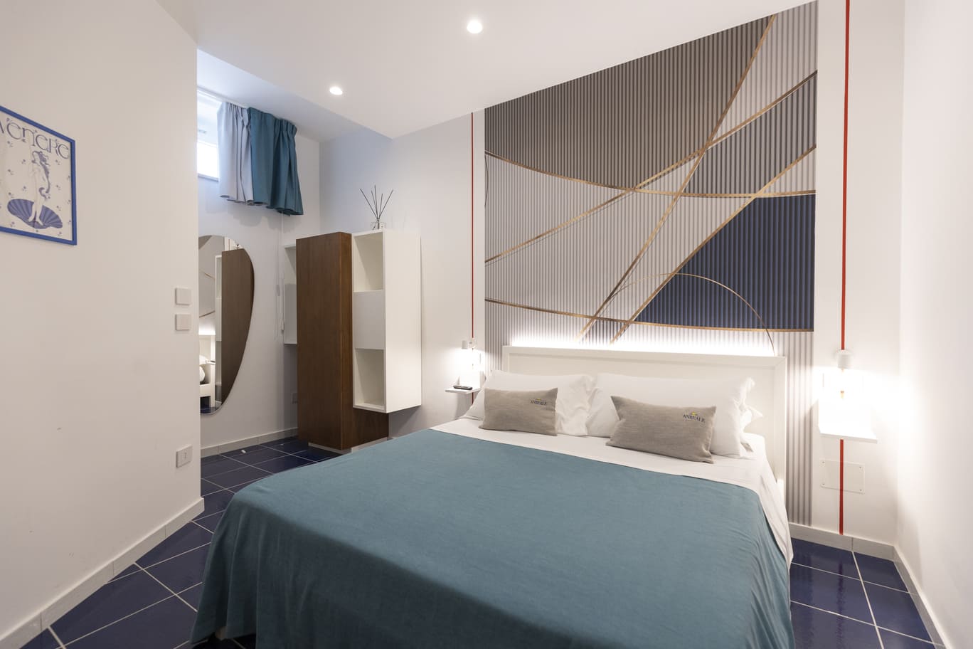 Venere is a Junior Suite on the first floor, with access via a magnetic card. It has a King Size double bed in the room and a single ottoman bed, air conditioning, Wi-Fi, smart TV, windows with electric opening, safe.